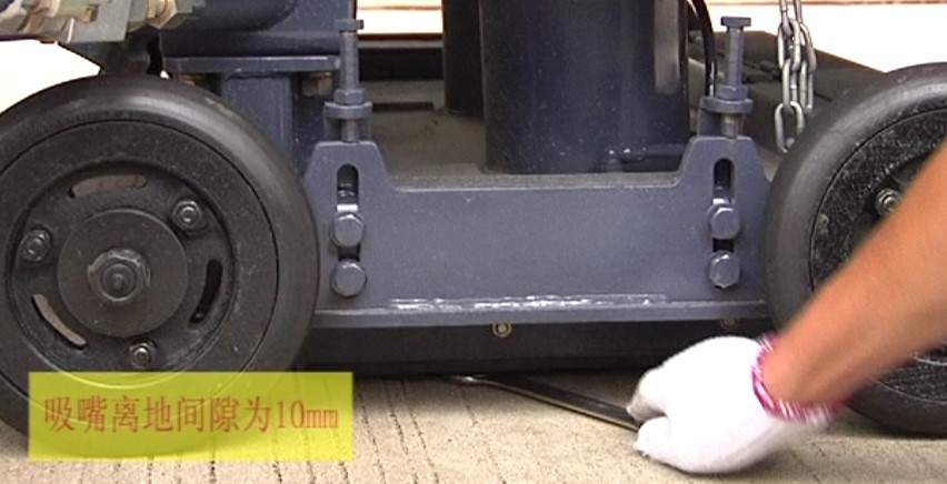 6、当吸力效果差时,应注意检查吸尘系统的密封情况,吸管、吸嘴胶垫有无破裂,吸嘴处有无超过吸管直径的物件堵在下面,吸嘴离地间隙是否合适(正常工作时,底部橡胶板离地间隙调整到10mm左右)。