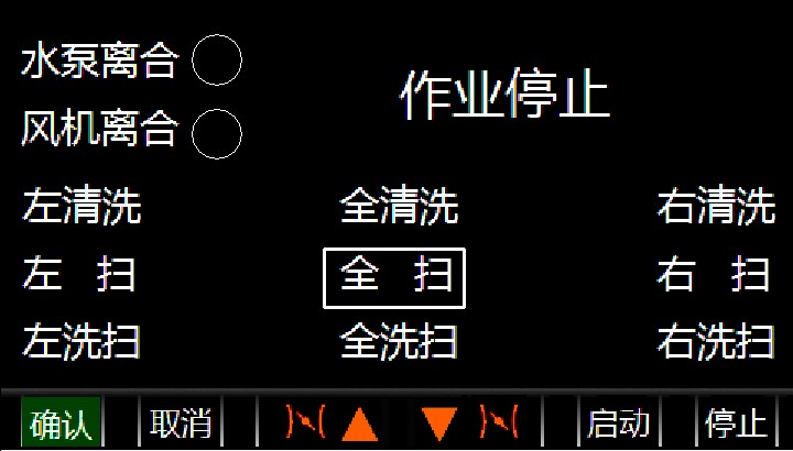 3) 根据实际路况选择 “清洗”、“扫路”及“洗扫”任一种作业模式并确认启动;
