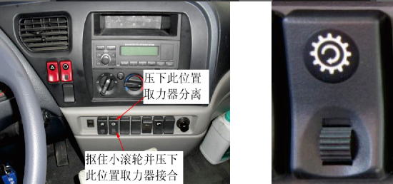 2)大型压缩式垃圾车车:待底盘气压上升到大于0.7Mpa时,踩下离合器踏板,操纵取力器开关使其接合。