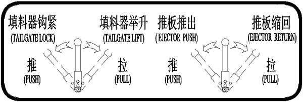 首先拉出填料器操纵手柄,填料器举升直到开启到位即松手,使手柄回到中立位置。再将推板操纵手柄往里推,推板推卸垃圾至最后位置时即松手,使手柄回到中立位置。检查垃圾箱后部并清除残留垃圾。填料器下降要在驾驶室内的控制盒上操作,使填料器下降到位、再操作手动多路阀进行钩子锁紧为止。