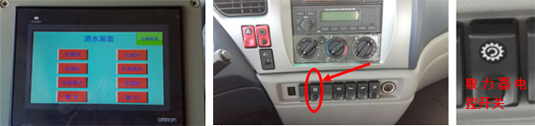 1、启动主发动机,确认底盘气压≥0.65Mpa时,打开触摸屏下方的按钮接通电源,选择洒水画面;