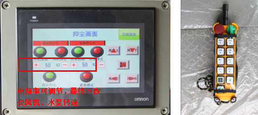 温馨提示:可通过触摸屏或遥控器上的方向操作按钮控制喷雾机的喷雾方向,通过调整运行电频率可调节风机及水泵输出功率。