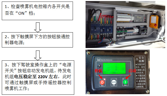 喷雾机工作时禁止关闭发电机组,如发生特殊情况需立即停机时可使用“急停按钮”,可实现整机停机状态。
