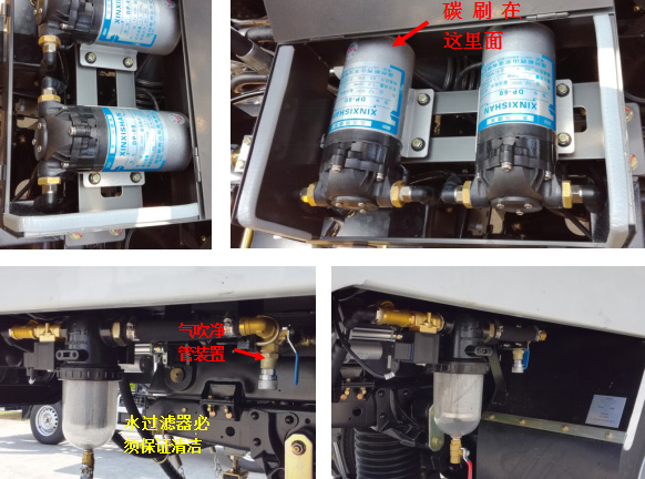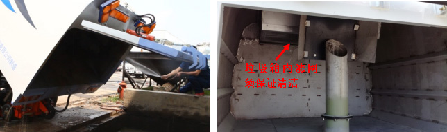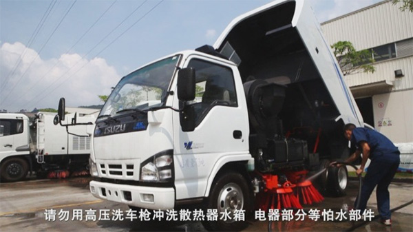 1)每日作业完成后,应清洗整车内外部,特别是垃圾箱过滤网、吸筒、后门胶条、门框等易堵塞部位应冲洗干净,对于电气部分等怕水部件请勿用水冲洗;