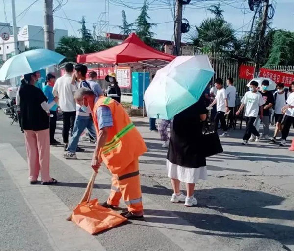 结合《关于加强2022年高考期间环境噪声监督管理的通告》六枝龙马“橙色”环卫工人们采取“无打扰静音作业”模式,错时错峰,确保考场周边安静、干净的城市容颜。